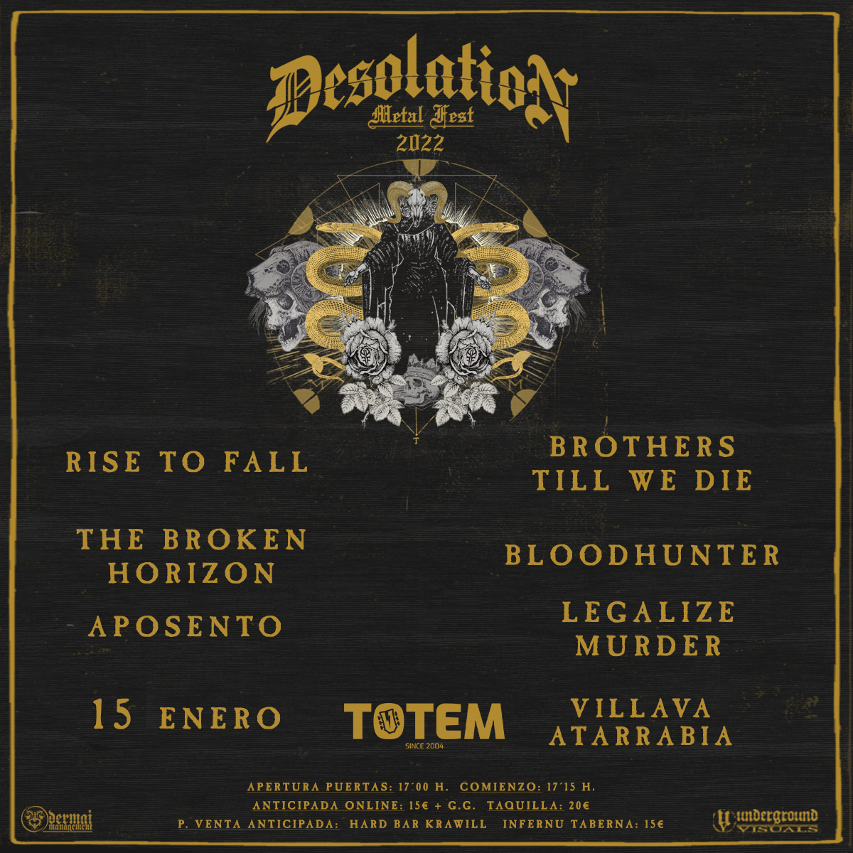 EUSKARA Facebook Twitter Instagram Youtube RISE TO FALL + BROTHERS TILL WE DIE + THE BROKEN HORIZON + BLOODHUNTER + APOSENTO + LEGALIZE MURDER [APLAZADO] Entradas Físicas Infernu Tabernap Hard Bar Krawill Entradas Online Musikaze Hora Apertura: 17:00h Concierto: 17:30h Precio Anticipada: 15€ + Gastos Taquilla: 20€