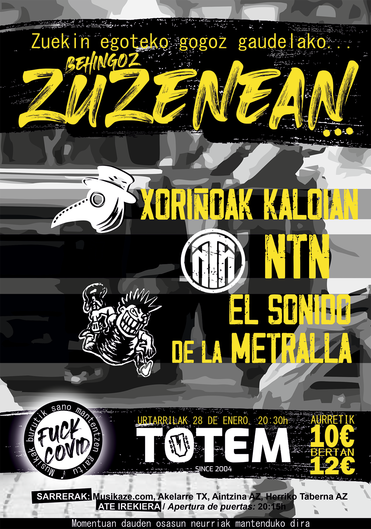 EUSKARA Facebook Twitter Instagram Youtube NTN + XORIÑOAK KALOIAN + EL SONIDO DE LA METRALLA [APLAZADO] Entradas Físicas Entradas Online MUSIKAZE Hora Apertura: 20:0Oh Concierto: 20:30h Precio Anticipada: 10€ + gastos Taquilla: 12€
