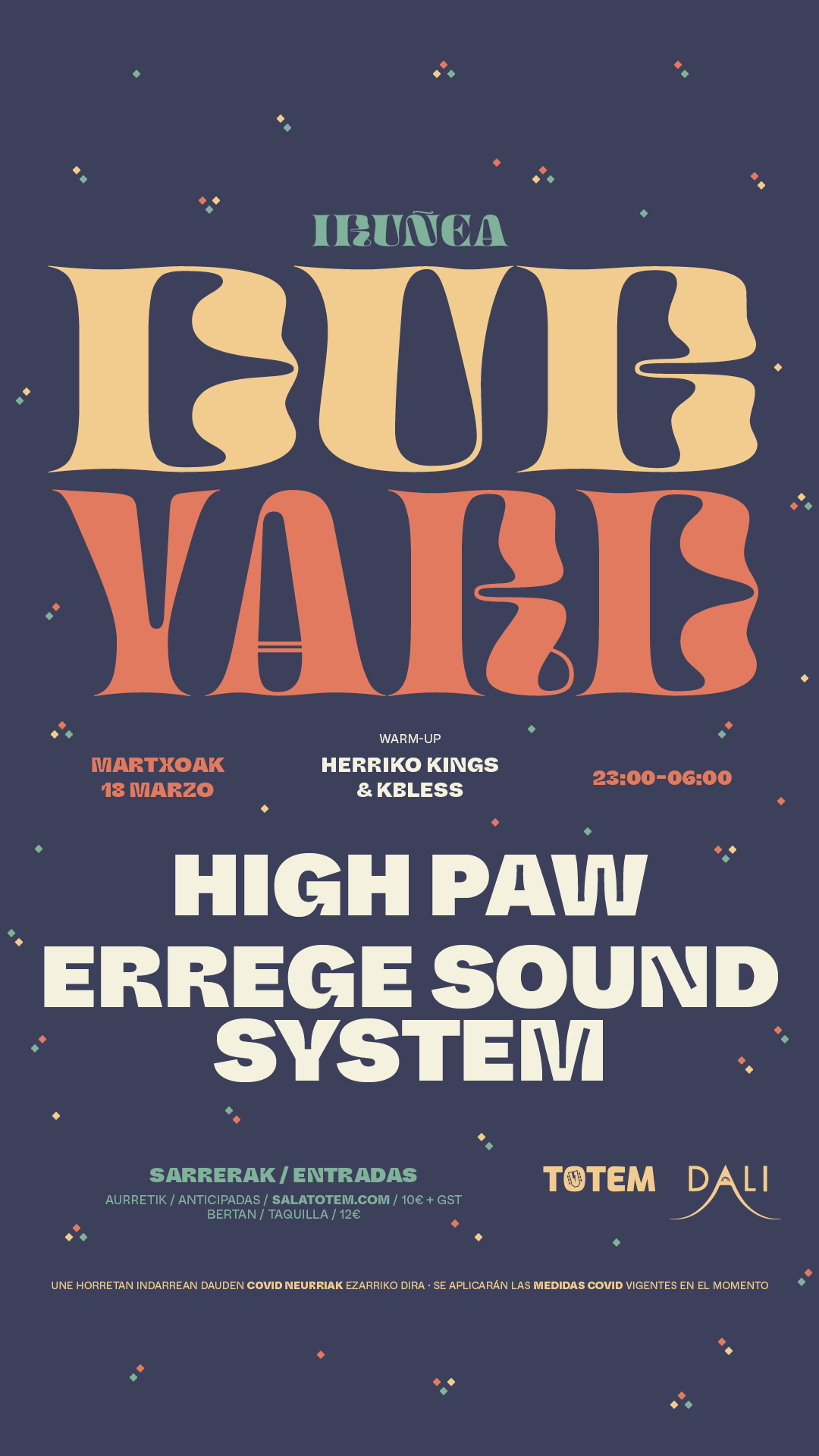 EUSKARA Facebook Twitter Instagram Youtube IRUÑEA DUB YARD HIGH PAW +ERREGE SOUND SYSTEM +HERRIKO KINGS +KBLESS VIERNES 18 DE MARZO Entradas Online Musikaze Hora Apertura: 23:00h Cierre: 06:00h Precio Anticipada 10€ + gastosTaquilla 12€