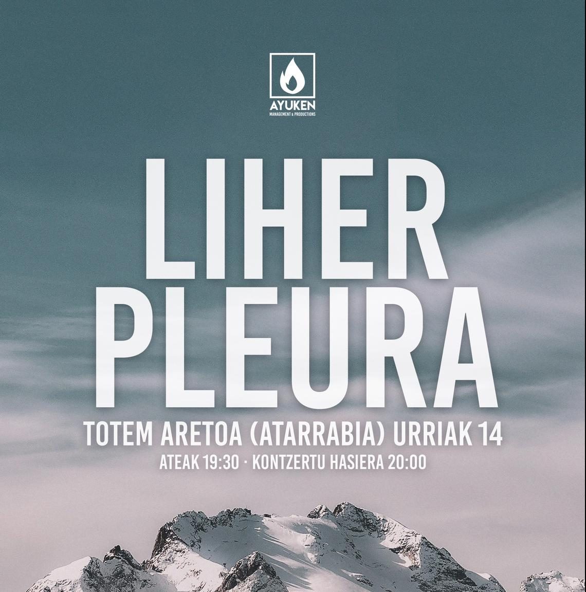 CASTELLANO Facebook Twitter Instagram Youtube LIHER + PLEURA TOTEMen pandemian eman zuten kontzertuaren ondoren, LIHER maskara eta aulkirik gabe itzuli da oraingoan. Gure ahultasun batekin batera etorriko dira, PLEURA baztandarrak. Riff, melodia eta rock-and-roll indartsuen gaua. Sarrerak Online WEGOW Ordua Irekiera: 19:30Kontzertuak: 20:00 Prezioa Sarrera: 12€ + gastuak