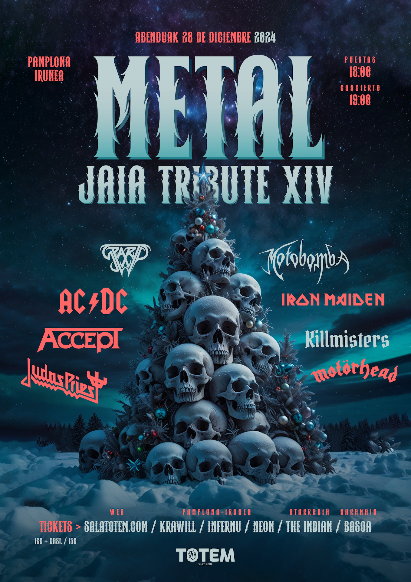 EUSKARA Facebook Twitter Instagram Youtube METAL JAIA TRIBUTE XIV SPARTO con temas propios y tributo a AC/DC, ACCEPT y JUDAS PRIEST MOTOBOMBA tributo a IRON MAIDEN KILLMISTERS tributo a MOTÖRHEAD Entradas Musikaze (web) Krawill Infernu Neon The Indian Basoa Hora Puertas 18:00Conciertos 19:00 Precio Anticipada: 12€ + gastos