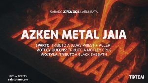 EUSKARA Facebook Twitter Instagram Youtube AZKEN METAL JAIA TRIBUTE (SPARTO + WOJTYLA + MÖTLEY QUEENS) Sarrerak MUSIKAZE Ordua Ateak: 18:30 Prezioa 12 + gastuak